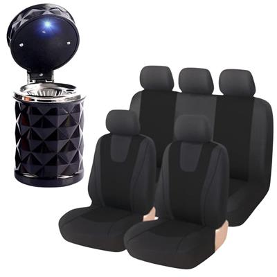 7pc Premium Black PU Leather & Fabric Car Seat Covers + Free Clip-On Trash Bin & Ashtray