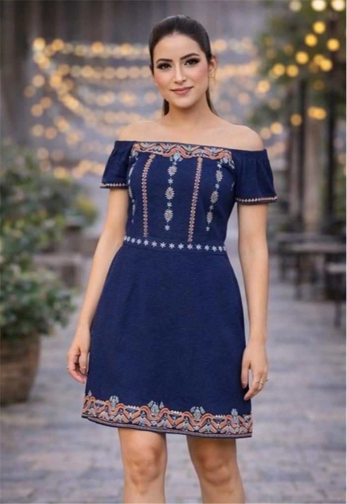 Description: Step out in style with the Midnight Elegance Off-Shoulder Dress, designed to give you a chic and sophisticated look. Featuring a rich navy blue base with delicate embroidered detailing, this dress blends elegance with modern flair. The off-shoulder neckline adds a feminine and trendy touch, while the short flared sleeves enhance its stylish appeal. With a flattering fitted waist and flowy skirt, it offers both comfort and a graceful silhouette—perfect for special occasions or evening outings. Key Features: Elegant off-shoulder blue dress Beautiful embroidered detailing for a refined look Stylish flared sleeves for added charm Flattering fit with a comfortable silhouette Lightweight and breathable fabric Perfect for parties, dinners & special occasions Sizes Available: S, M, XL A timeless and stylish piece that adds effortless elegance to your wardrobe.