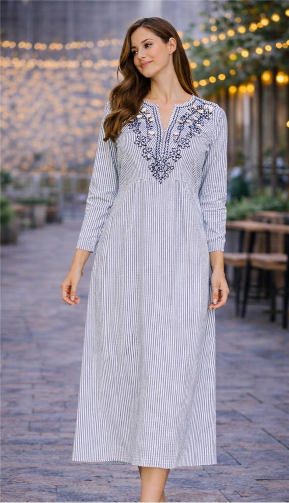 Shell Long Sleeve Dress – Elegant Simplicity with a Modern Touch Step into effortless elegance with this shell long sleeve dress, designed for a refined and timeless look. Featuring a soft striped pattern with intricate embroidery detailing at the neckline, this dress blends classic style with modern sophistication. The relaxed, flowy silhouette offers all-day comfort, while the long sleeves provide a graceful and polished finish. Perfect for both casual and semi-formal occasions, this dress is a versatile addition to your wardrobe. Product Details: Soft, lightweight, and breathable fabric Elegant vertical stripe design Intricate embroidered neckline detail Long sleeves for a refined look Flowy, comfortable fit for all-day wear Available Sizes: 0, 2 Perfect for brunch, work, casual outings, and special occasions—this dress delivers effortless style and comfort in one beautiful piece.