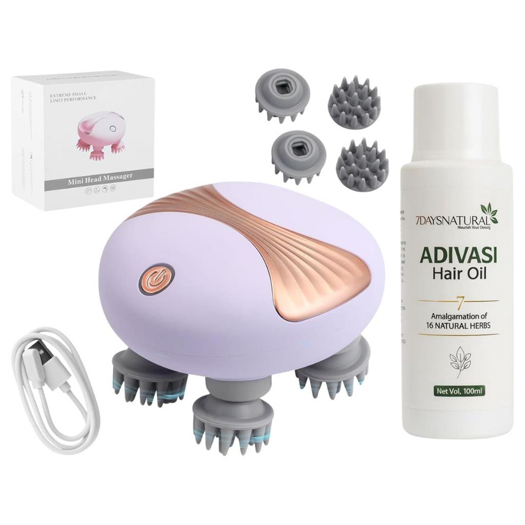 Experience soothing 360° massage with infrared red light therapy and soft silicone heads — designed to relieve tension, boost circulation, and promote healthier, stronger hair. ✅4-speed massage settings ✅Red Light Therapy – Infrared care supports scalp maintenance, helping nutrients and oils absorb better while promoting stronger, healthier hair. ✅Smart Timer – Built-in 15-minute auto shut-off lets you drift into relaxation worry-free. ✅One-Touch Control – Simple operation with a single button to switch speeds or power off. ✅Hygienic & Waterproof – Detachable massage heads for easy cleaning, waterproof for shower use with shampoo or oils. ✅Compact & Portable – Weighs only 167g, perfect to slip into your bag for stress relief anytime, anywhere. ✅Full-Body Versatility – Not just for your scalp—enjoy soothing relief on arms, legs, shoulders, and more. ✅Revitalizes scalp & supports healthy hair growth ✅Relieves tension, headaches & migraines ✅Enhances circulation & relaxation ✅Boosts the effectiveness of oils and treatments Stimulates blood circulation, awakens hair roots, and supports faster, healthier hair growth. Paired with our 16-in-1 Adivasi Hair Growth Oil, You get a complete rejuvenation combo that nourishes roots, strengthens strands, and leaves you feeling refreshed — inside and out.