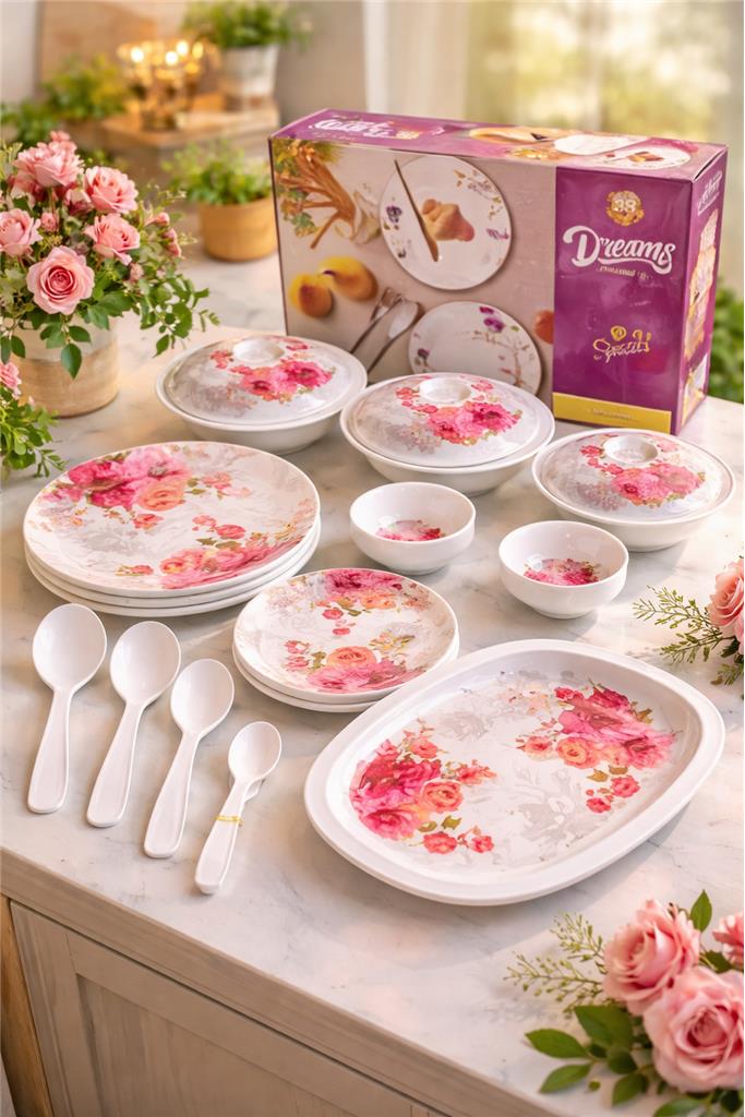 🍽️ Complete 38-piece dinner set for everyday dining and special occasions 🌸 Elegant floral design to enhance your table setting 🍛 Includes: 6 full plates, 6 half plates, 12 bowls 🍚 1 rice plate for serving larger meals 🥣 3 donga base bowls with 2 matching lids 🥄 2 serving spoons and 6 tea spoons included 🛡️ Durable, lightweight, and heat-resistant material ✨ Easy to clean and perfect for daily use 🎁 FREE dish rack organizer included 🏠 Ideal for family meals, gatherings, and entertaining SOLD BY PRESTIGE HOME STORE