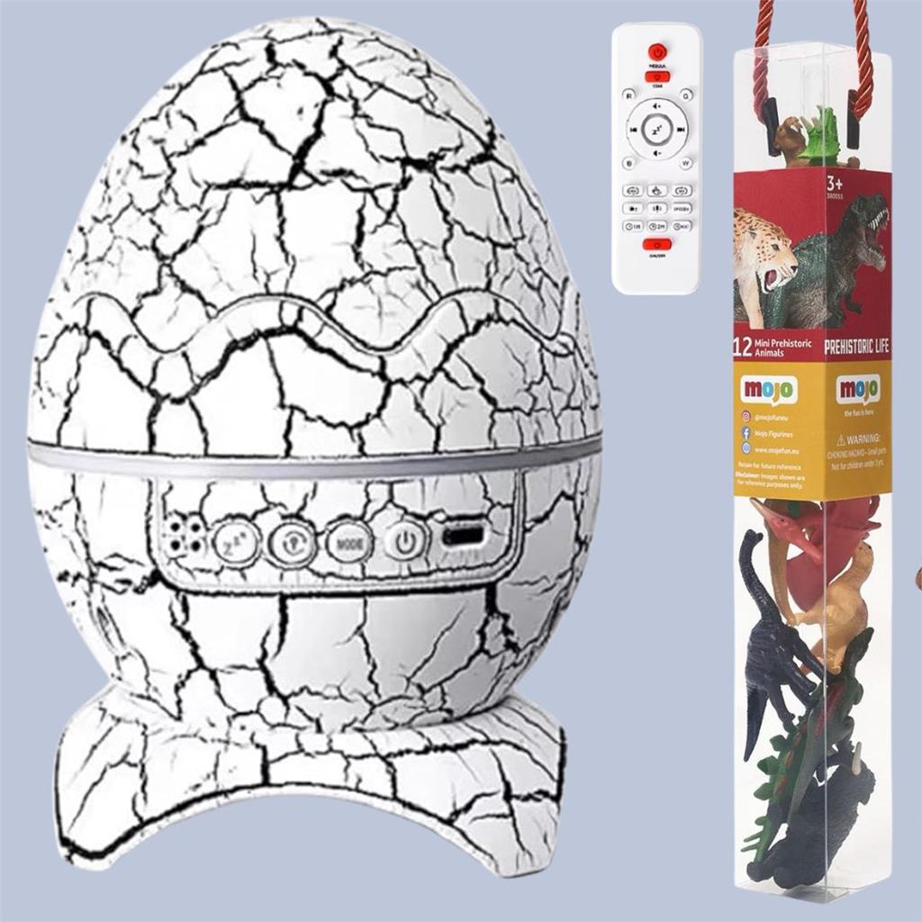 4-in-1 Magical Experience – Nightlight, Galaxy Projector, White Noise Machine & Bluetooth Speaker in one! Dino Egg with Galaxy Magic – Projects a dreamy starry sky with 7 vibrant colors and 14 lighting effects. Soothing Sounds & Music – Includes calming white noise and connects via Bluetooth for your favorite playlists. Full Remote Control – Adjust brightness, rotation, colors, music, and timers without leaving bed. Custom Timer Modes – Choose 1hr, 2hr, or enjoy auto shut-off after 4hrs for worry-free sleep. Mood Matching Control – Brightness and rotation speed are fully adjustable to fit your vibe. Type-C Powered – Comes with a modern Type-C plug for stable performance. Remote Requires 2 AAA Batteries – (Not included) Perfect Gift Idea – For curious kids, galaxy lovers, or anyone needing a dreamy escape. Cute & Compact – Approx. 16cm x 11cm – fits perfectly in bedrooms, nurseries, or desks. + FREE Mini Dinosaur Animal Playset