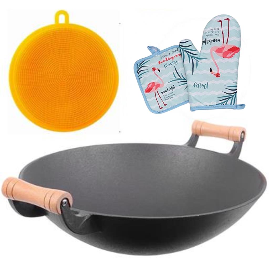 Big, Bold & Built to Last – 15-inch thick cast iron wok for serious cooking power. Depth That Delivers – 5-inch deep bowl ideal for stir-fries, stews, and saucy meals. Even Heat, Faster Meals – Uniform heat distribution means quicker, tastier results every time. Natural Non-Stick Performance – Cook with less oil while enjoying smooth food release. Double Wooden Handles – Comfortable grip and cool-touch control for confident tossing and lifting. No Coating, No Toxins – 100% pure cast iron—zero synthetic layers, just safe, wholesome cooking. Round Bottom Versatility – Perfect for traditional wok-style cooking with intense flavour. Serve Big, Share More – Spacious design lets you cook for the whole family or a dinner party. Durable & Reliable – Thickened cast iron body built to last through years of daily use. Low Maintenance, High Reward – Season it right and enjoy a naturally non-stick, easy-to-clean surface. Free Silicone Scrubber and mitten set Included – Keep your wok spotless with the bonus cleaning essential!
