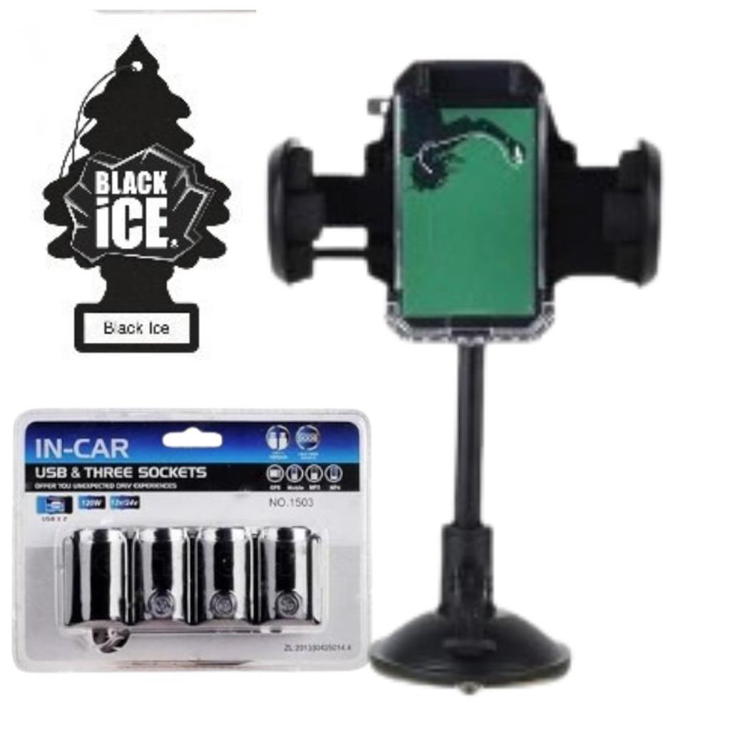 ✅360° Adjustable Phone Holder Dual secure mounting options: vent clip or suction cup Shockproof design & flexible arm One-touch operation for easy use Full rotation for safe navigation & calls ✅4-in-1 USB & Triple Socket Car Splitter 3 sockets + 2 USB ports for multiple devices Charge dash cams, GPS, phones, LED lights & more simultaneously Fast, safe & efficient power delivery Built-in fuse & blue indicator light for reliability Perfect for daily commutes, road trips, families & rideshare drivers ✅Free Car Air Freshener Keeps your car smelling clean & refreshing on every ride