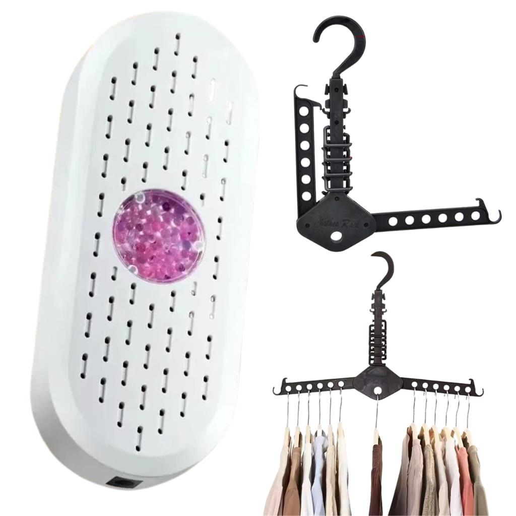Silica Gel Dehumidifier with Space-Saving Hanger – Product Highlights Fast-Action Silica Gel Dehumidifier Rapid Fresh Effect: Instantly tackles musty odors and moisture, preventing mold and mildew buildup. All-Weather Moisture Control: Effective in all seasons – summer humidity or rainy dampness. Compact & Easy to Use: Lightweight, portable design with one-button operation – ideal for users of all ages. Multi-Space Compatibility: Perfect for closets, shoe cabinets, lockers, bookshelves, and small spaces up to 5㎡. Clothes Drying Companion: Hang near laundry to reduce drying time and energy costs. Eco-Friendly Efficiency: Low-energy operation for sustainable, everyday use. Reliable Moisture Protection: Keeps any enclosed area fresh, dry, and odor-free. 360° Rotating Space-Saving Closet Hanger Magic Switch Design: 13 holes + 8 hooks for vertical or horizontal hanging with a 360° swivel head. Ultimate Space Saver: Holds up to 13 garments at once, maximizing closet capacity instantly. Versatile Usage: Ideal for drying or storing clothes both indoors and outdoors. Neat & Organized Living: Keeps clothes wrinkle-free and your space clutter-free. Universal Fit: Perfect for shirts, suits, sweaters, jackets, belts, and more. Durable & Portable: Made from strong, non-slip plastic – foldable and easy to carry or store.