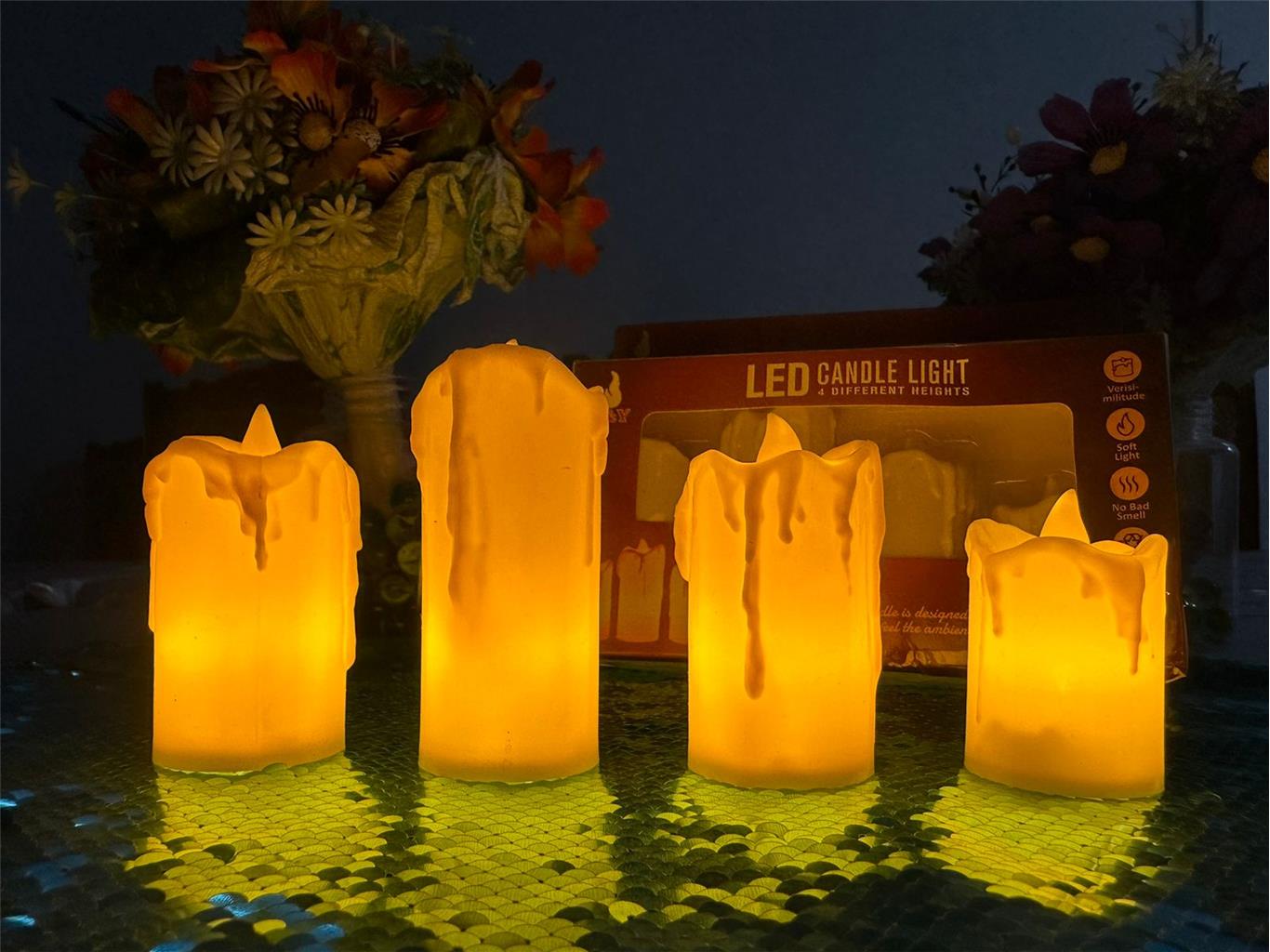 LED Candle Light – 4 Different Heights Set of 4 Candles – Includes 2 pieces (8cm), 1 piece (10cm), and 1 piece (6cm) for a natural decorative look. Realistic Flicker Effect – Imitates the gentle glow of real candle flames, adding warmth and coziness. Soft Ambient Lighting – Perfect for creating a relaxing mood in bedrooms, living rooms, bathrooms, or events. Flameless & Smokeless – No wax, no mess, no smell – safe for allergy sufferers, kids, and pets. Energy-Saving LEDs – Long battery life with low power consumption for extended use. Multipurpose Use – Ideal for home décor, romantic dinners, weddings, parties, and festive events. Safe & Stylish – All the charm of candles without the fire risk.