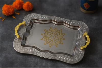 Large 19 x 14-inch Silver Serving Tray with Gold Handles ! A true showstopper — serve your guests in royal style this Diwali! Each piece is crafted from premium stainless steel with a mirror-polished silver finish and luxurious gold handles — strong, durable, and easy to clean. Bring home the Stainless Steel Serving Collection and let your table glow as bright as your diyas.