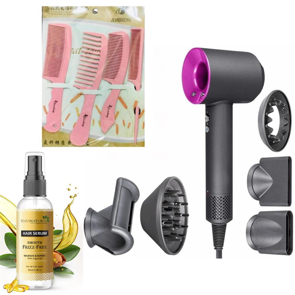 5-in-1 Leafless Pro Hair Dryer & Styler – Key Features Christmas Special Offer: Get a Free Premium Comb Set and Argan Oil Serum with every purchase. High-Speed Digital Motor: 110,000 RPM motor with advanced leafless technology for fast, efficient drying. All-in-One Styling Tool: Dry, smooth, curl, volumize, and tame frizz with five magnetic 360° attachments: Precision Styling Nozzle – sleek, defined styles Wide Styling Nozzle – faster drying Diffuser – enhances curls Flyaway Smoother – locks in shine Angled Volume Nozzle – adds lift and fullness Frizz-Control Hot & Cold Settings: Adjustable heat and airflow for perfect styling without damage. Negative Ion Therapy: Reduces frizz and static, leaving hair smooth and shiny. Intelligent Temperature Control: Protects hair from overheating, prevents heat damage. Ergonomic & Comfortable Design: Lightweight, ultra-quiet, and easy to handle for effortless styling. Convenient & Practical: 2.8m extra-long cord and wall mount for easy storage and mobility. Safe & Hygienic: Leafless design ensures easy cleaning and safety. Suitable for All Hair Types: From straight to curly, fine to thick hair. Professional Salon Results at Home: Achieve salon-quality styling in half the time.
