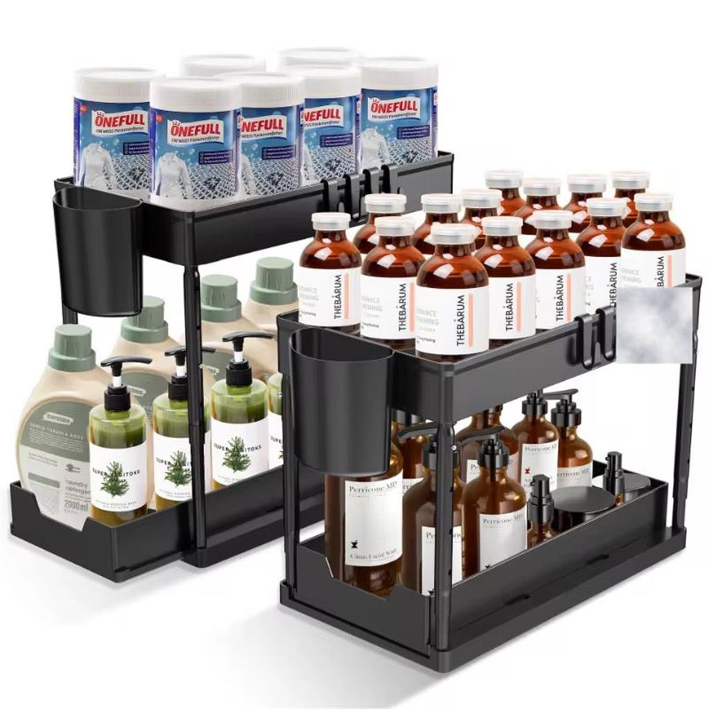 2-Tier Pull-Out Drawer Organizer Rack Stand Key Features: Say Goodbye to Clutter: Keeps your kitchen, bathroom, or laundry area neat, organized, and stylish. Dual-Tier Design: 2-tier rack includes one slide-out drawer for easy access and one stable top tray for secure storage. Strong & Durable Build: Supported by 4 sturdy steel poles with rubber plastic stoppers — ensures firm, wobble-free stability. Premium Laser-Cut Design: Elegant and functional drawers with smooth edges and modern appeal. Smart Add-Ons: Comes with 2 bonus hooks and a utensil pocket holder — ideal for hanging brushes, sponges, or towels. Compact Yet Spacious: Perfectly sized at 40.5 cm (L) × 22.5 cm (W) × 32 cm (H) — fits under sinks, inside cabinets, or around pipes. Rust-Proof & Waterproof: Built with long-lasting materials for hassle-free use in damp environments. Easy Tool-Free Assembly: Quick to set up — no screws or tools required. Sleek Modern Finish: Adds a touch of elegance to any space.