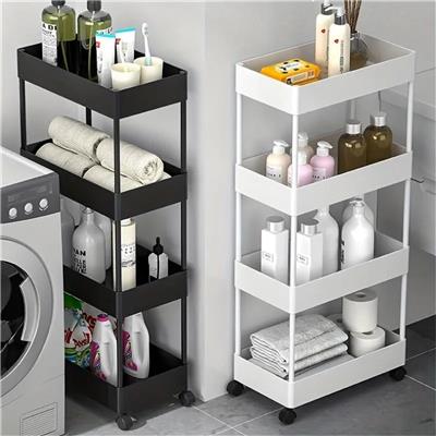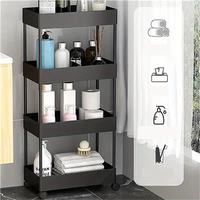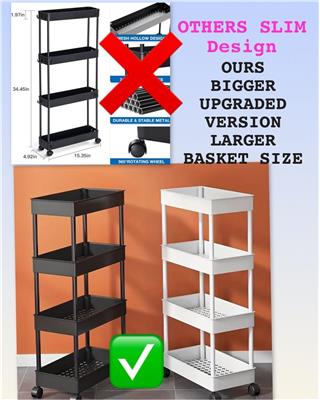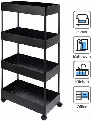 ✅ 4 spacious tiers — perfect for storing kitchen supplies, toiletries, office items, or cleaning essentials. ✅ Solid steel construction — holds up to 10 kg with ease! ✅ Compact design: only L50 × W19 × H66 cm — slim enough to fit in tight spaces but tall enough to maximize storage. ✅ Smooth-rolling 360° wheels — move it wherever you need it! ✅ Bonus 4 side hooks — hang your utensils, towels, or accessories for extra convenience. From the kitchen to your office, bathroom, or laundry area — this modern black finish blends beautifully with any décor. Built with a strong steel frame and durable ABS shelves.