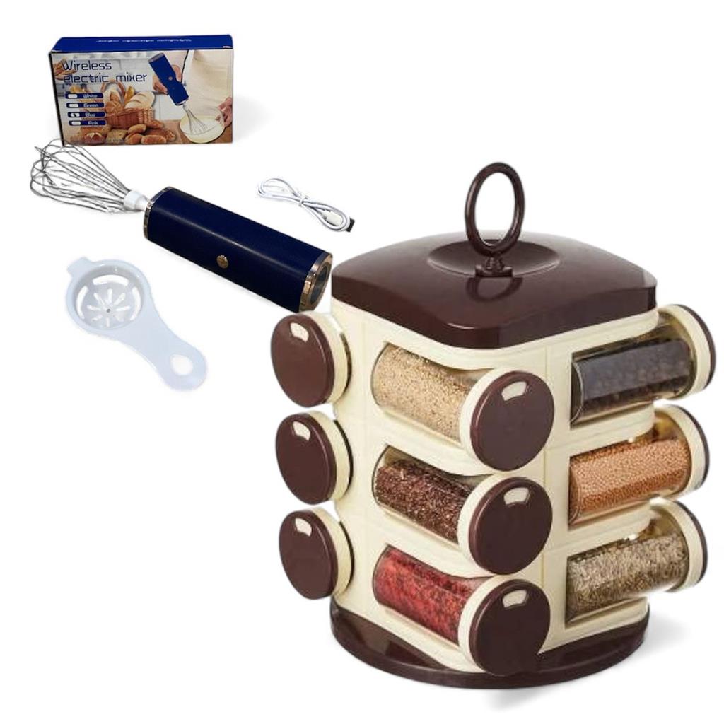 12-Piece Rotating Spice Rack for easy kitchen organisation. Smooth 360° rotation for quick spice access. 3-tier design with 12 neatly arranged jars. Rotatable jar lids with controlled dispensing holes. Made from BPA-free, food-grade, unbreakable material. Lightweight, durable, and dishwasher-safe. Detachable parts for easy cleaning and refilling. Compact, space-saving size — 20 × 20 × 25 cm. Modern, stylish look that enhances kitchen décor. 30W Rechargeable Electric Whisk included in the combo. Perfect for whipping coffee, eggs, cocoa & light batters. Simple 1-speed operation for quick everyday mixing. USB rechargeable — no batteries required. Great for home cooks, bakers, and kitchen lovers. Ideal Christmas gift for family and friends. Limited holiday stock available.