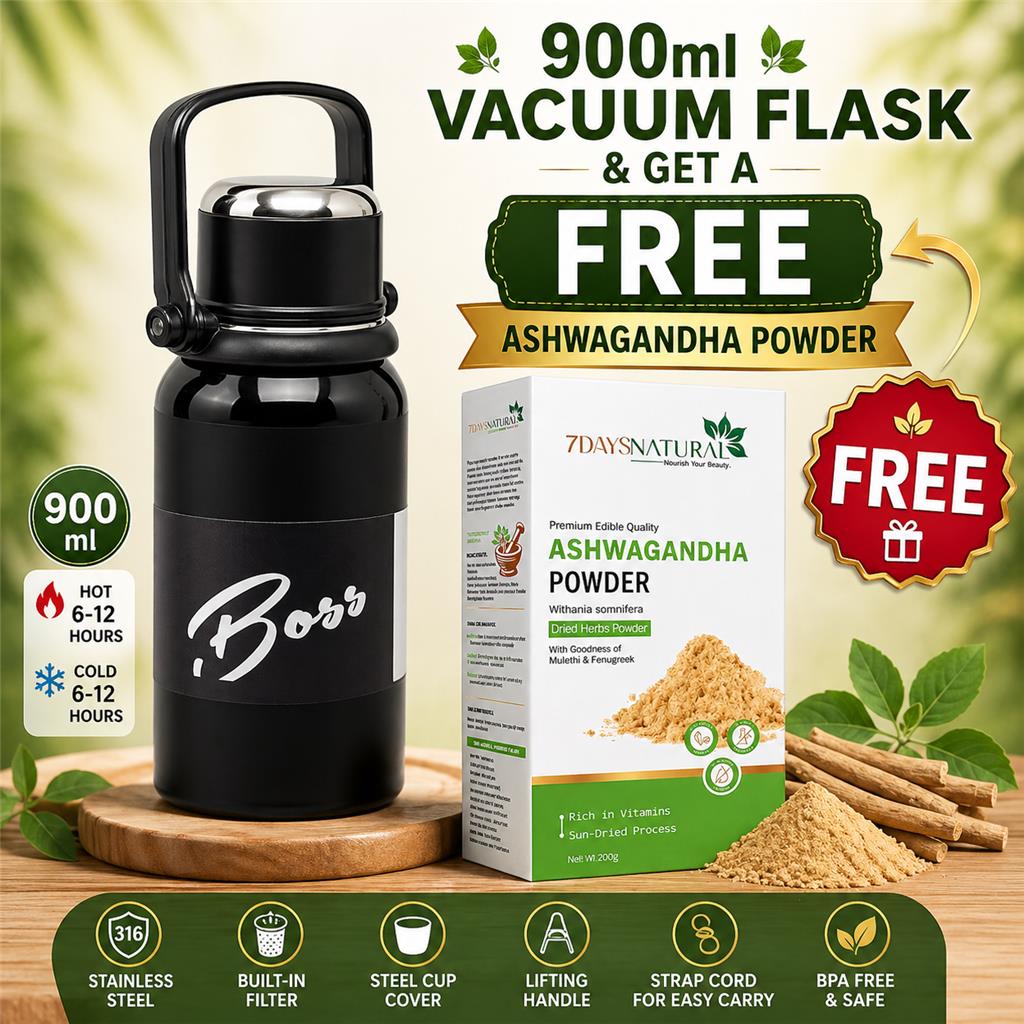 900ml Vacuum Flask & Get a FREE Ashwagandha Powder Pack Premium MDHL Vacuum Insulated Kettle Bottle (900ml) Made with 316 stainless steel for durability, safety, and long-lasting performance. Keeps drinks hot or cold for 6–12 hours — perfect for school, work, travel, and daily use. Comes with a secure lifting handle and comfortable strap cord for easy carrying. Includes a stainless steel cup cover for convenient sipping anywhere. Built-in removable stainless steel filter — ideal for herbal drinks, detox water, infused teas, and powdered supplements. Stylish, compact 27cm design, available in white or black. Suitable for women, kids, couples, students, and anyone on the go. Fuel your body with the power of Ashwagandha Powder, a trusted natural adaptogen known for supporting stress relief, energy, and overall wellness. ✅ Helps Reduce Stress & Anxiety – Supports a calm and balanced mind ✅ Boosts Energy & Stamina – Improves daily performance and endurance ✅ Enhances Focus & Clarity – Supports better concentration and productivity ✅ Supports Immunity – Helps strengthen the body’s natural defense system ✅ Promotes Better Sleep – Encourages relaxation and restful sleep cycles ✅ Overall Wellness Support – A natural way to maintain balance in daily life SOLD BY FITNESS PRO TT