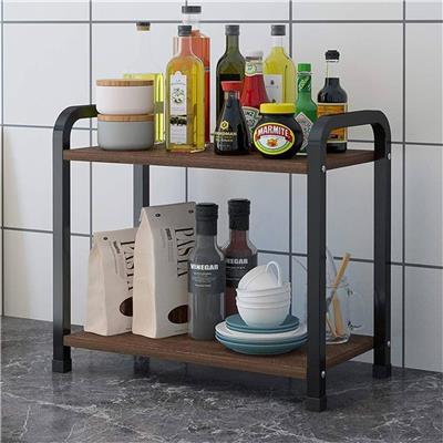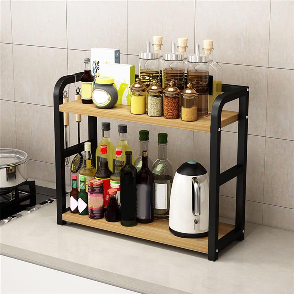 Built with heavy-duty wrought iron and premium solid wood shelves. Two spacious tiers, it neatly stores your spice jars, bottles, tea tins, sauces — anything that usually clutters your counter. The elevated tier height gives you more room than regular racks, so even tall bottles fit with ease. It also comes with 3 stainless steel hooks… perfect for hanging ladles, spatulas, scissors, salon tools, or accessories. Ideal for kitchens, salons, spas, offices, or even dressing tables — anywhere you need elegant, compact storage.