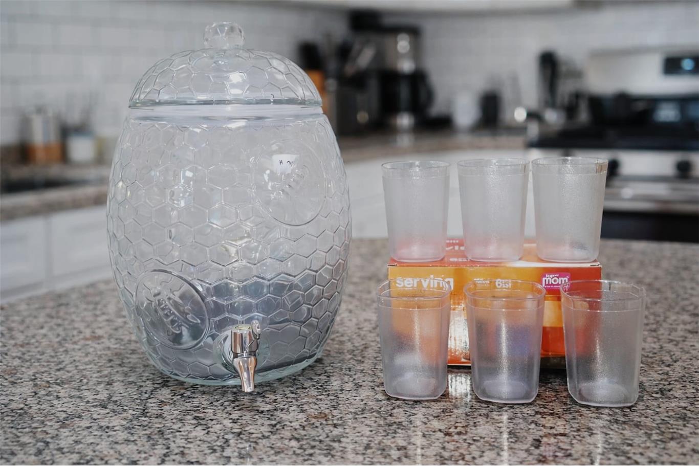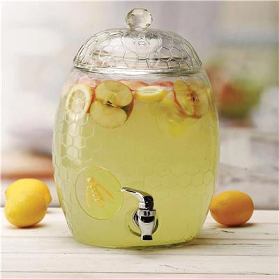 Elegant Beverage Glass Dispenser Set Stylish beehive-design glass dispenser paired with 6 matching water glasses for a complete serving solution. Perfect for Any Occasion Ideal for backyard parties, office use, hotel receptions, corporate events, and family gatherings. Premium Beehive Design (9.5 liter ) Eye-catching textured glass design turns drinks into a beautiful centerpiece that elevates any table setup. Includes 6 Matching Water Glasses Comfortably shaped for easy grip, stability, and enhanced drinking experience—always ready to serve guests. 100% Safe & Pure Glass Made from lead-free, BPA-free glass to keep beverages fresh, clean, and free from harmful chemicals. Smooth-Flow Tap for Easy Serving Sturdy, leak-resistant dispenser tap ensures mess-free pouring with controlled flow. Showcases Beverage Colors Beautifully Perfect for water, iced tea, juice, milk, lemonade, mocktails, and cocktails. Reusable & Eco-Friendly Durable glass construction designed for long-term use while reducing plastic waste. Timeless & Versatile Style Blends effortlessly with modern and classic décor for both everyday use and special occasions.