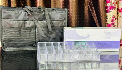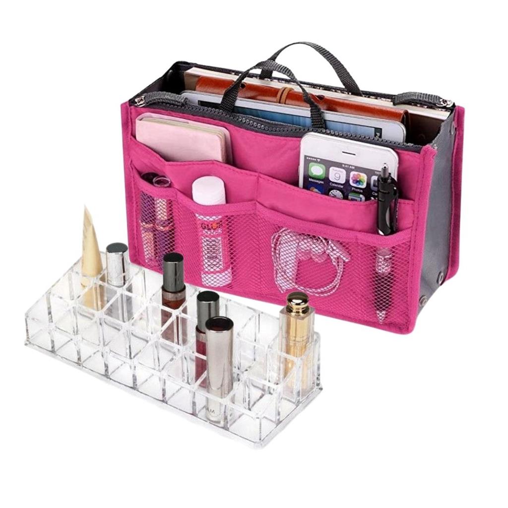 Pocket Bag Organiser + 24-Slot Acrylic Makeup Organiser • Multi-compartment handbag organiser with 13 pockets to neatly store phone, wallet, cosmetics, toiletries, pens, and daily essentials • Smart layout includes zippered sections, open centre compartment, mesh and nylon pockets for easy classification • Effortless bag transfer — simply lift the organiser and move everything at once • Durable, lightweight, water-resistant, antibacterial nylon fabric protects belongings • Adds structure to handbags while keeping items visible and accessible • Compact size (28.5 × 17 × 8.5 cm) fits most handbags without bulk • Stylish, modern design that enhances everyday organization • 24-slot acrylic organiser holds lipsticks, cosmetics, jewelry, and small accessories • Clear design lets you quickly see and access what you need • Reinforced high-grade acrylic frame — sturdy and long-lasting • Easy-to-clean surface keeps makeup hygienic • Keeps vanity, bathroom, or dresser neat and clutter-free • Each slot sized perfectly for standard lipsticks and small items • Ideal for organized living at home or on the go • Perfect for handbag lovers, makeup users, and busy lifestyles • Great gift for anyone who values neat storage Sold by Beauty haul