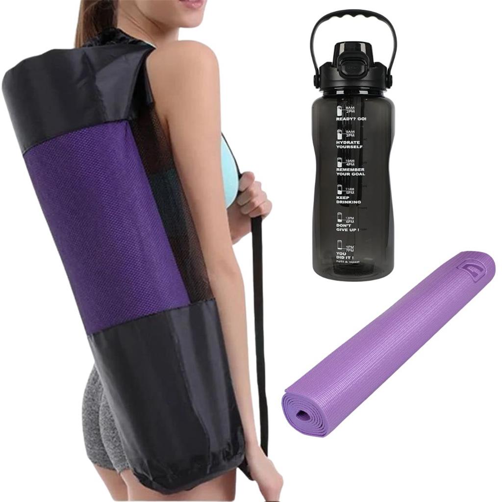 Upgrade your daily workout routine with the Triple Fitness Combo, a convenient and practical set designed to support your fitness, hydration, and portability needs. Includes a PVC Yoga Mat, a 2-Liter Motivational Water Bottle, and a Yoga Mesh Pullstring Storage Bag Durable PVC construction designed for long-lasting use during yoga, stretching, pilates, and general workouts. Slip-resistant textured surface helps improve stability and grip, allowing you to maintain proper posture and balance during exercises. Compact and lightweight, making it easy to roll up and store when not in use. Large 2-liter capacity helps you stay hydrated throughout the day during workouts or outdoor activities. Features motivational time markers to encourage regular water intake and help you meet your hydration goals. Leak-resistant design with a secure lid for easy carrying to the gym, office, or outdoor workouts. Storage Bag is Breathable and mesh design helps air circulate around the mat to prevent moisture buildup after workouts. Pullstring closure allows quick storage and easy access to your yoga mat and accessories. Lightweight and portable — perfect for carrying your mat to the gym, yoga studio, park, or travel workouts. SOLD BY FITNESS PRO TT