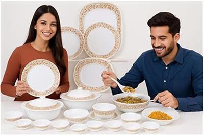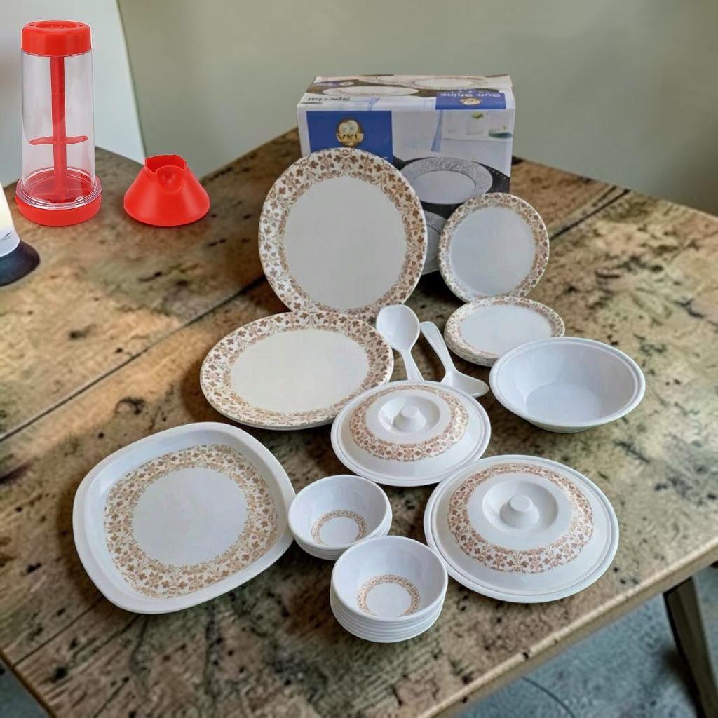 🍽️ Complete 38-piece dinner set for everyday dining and special occasions 🌸 Elegant floral design to enhance your table setting 🍛 Includes: 6 full plates, 6 half plates, 12 bowls 🍚 1 rice plate for serving larger meals 🥣 3 donga base bowls with 2 matching lids 🥄 2 serving spoons and 6 tea spoons included 🛡️ Durable, lightweight, and heat-resistant material ✨ Easy to clean and perfect for daily use 🎁 FREE Free Rotary Sieve included 🏠 Ideal for family meals, gatherings, and entertaining SOLD BY TRINIRETAIL