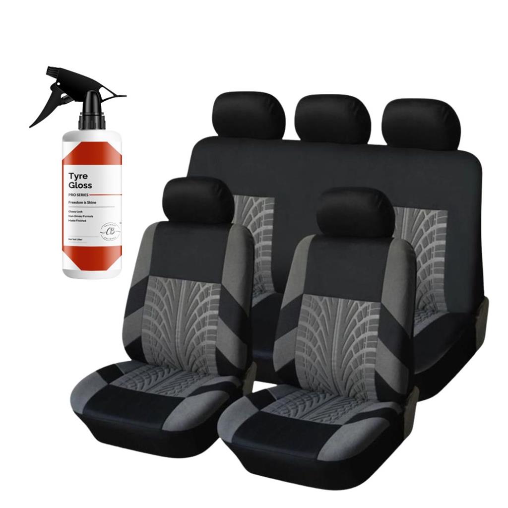 Product Highlights: Complete 9-Piece Set: Includes 5 headrest covers, 1 driver seat cover, 1 passenger seat cover, 1 backrest cover, and 1 back seat cover for full interior protection. Stylish Tyre Track Design: Sleek black and grey color scheme with a sporty, modern aesthetic—adds instant visual appeal to your car. Premium Comfort Materials: Made from high-quality elastic polyester with soft foam padding for extra comfort and ergonomic support. Water-Resistant & Breathable: Keeps you cool in summer and shields seats from sweat, spills, rain, and grime. Easy Maintenance: Fully machine washable—simply remove and toss in the wash for a like-new clean. Universal Fit Design: Elastic edges allow a snug fit on most cars, SUVs, trucks, and vans—no tools required. Durable & Kid/Pet-Friendly: Built to handle daily wear, messy kids, pets, food spills, and outdoor dirt. Reduces Driving Fatigue: Foam cushion layer provides added support on long drives or daily commutes. BONUS: Every set now includes a FREE Tire Shine Bottle to keep your ride shining inside and out! SOLD BY EZBUY