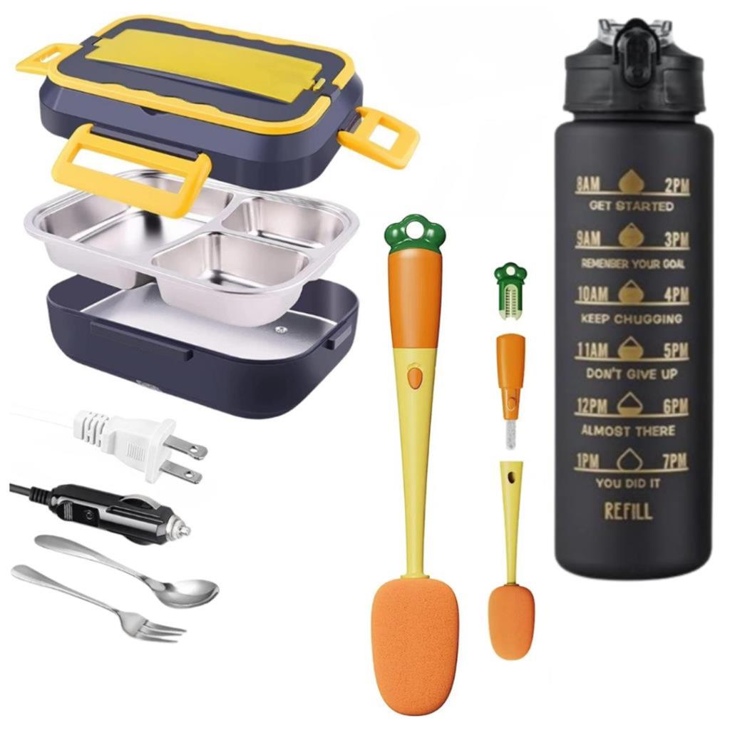 3-in-1 Portable Electric Lunch Kit – Product Highlights Hot Meals Anytime, Anywhere – 60W heating system warms food in just 10–15 minutes – no microwave needed. Dual Power Compatibility – Works with 110V wall outlet, 12V car, or 24V truck socket — no adapters required. Spacious & Smart Design – 1.5L stainless steel 3-compartment tray keeps food separated, fresh, and flavorful. Leak-Proof & Secure – Comes with a locking lid and durable utensils included for convenience. Stay Hydrated All Day – FREE 900ml water bottle with motivational time markers and built-in straw. Effortless Cleaning – FREE 3-in-1 bottle brush reaches tight lids, narrow openings, and hidden corners. Perfect for On-the-Go Lifestyles – Ideal for office workers, students, drivers, commuters, gym-goers, and parents. Complete Meal System – Heat, Hydrate & Clean — all in one portable, easy-to-carry kit.