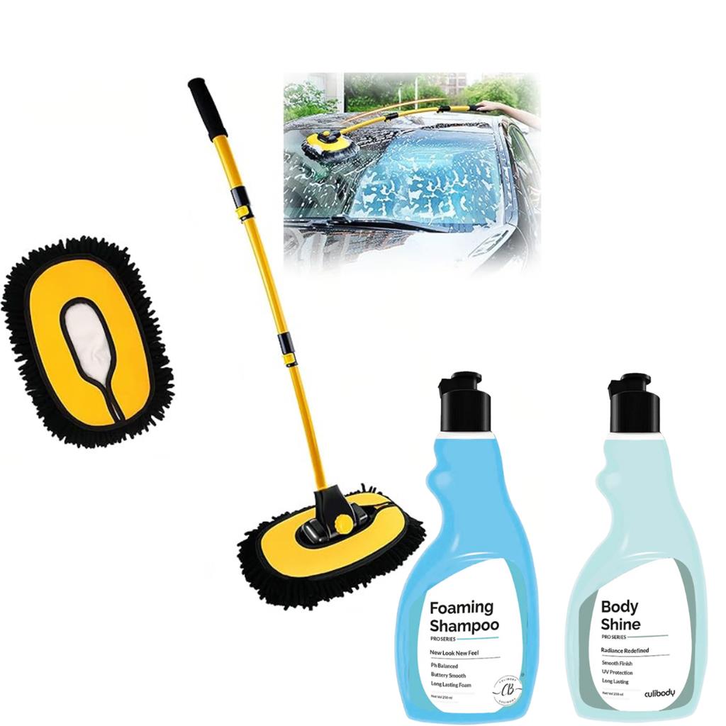 Product Description Points:- • All-in-one 3-in-1 car-care combo for deep cleaning, rich foam, and glossy shine • Includes telescopic 90° rotatable car wash mop for effortless full-vehicle cleaning • Adjustable aluminum handle extends from 35" to 55" for high and hard-to-reach areas • Ultra-soft microfiber mop head absorbs water fast and protects car paint • Perfect for cars, SUVs, trucks, windows, and home cleaning • Comes with 250 ml foaming car shampoo for thick, powerful foam • Removes dirt, mud, grime, and road dust safely from paint, glass, chrome, and plastic • Includes 250 ml body shine polish to enhance gloss and restore smoothness • Helps protect surfaces from dust, dullness, and light scratches • Delivers professional-quality wash and shine results at home • Saves time, effort, and money with a complete car-cleaning solution in one kit • Ideal for car lovers, weekend wash routines, gifting, and multipurpose cleaning