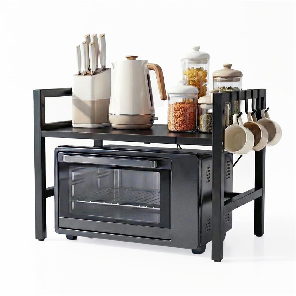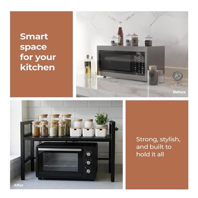 ✨ Spacious 2-tier multi-purpose rack designed to maximize countertop space and keep your kitchen organized ✨ Durable powder-coated steel frame ensures strong support, stability, and long-lasting performance ✨ Elegant walnut and black wood-finish design adds a modern touch to kitchens, offices, or laundry spaces ✨ Upgraded stainless steel side hooks provide extra storage for towels, oven mitts, utensils, or tools ✨ Large-capacity structure ideal for microwaves, air fryers, ovens, kettles, printers, jars, and more ✨ Non-slip feet keep the rack steady while protecting your countertops from scratches ✨ Easy assembly with a sturdy build you can rely on ✨ Smooth surfaces make cleaning quick and hassle-free ✨ Dimensions: 20" Length × 17" Height × 13.5" Breadth ✨ Important: If your microwave is taller than 13.5", it will not fit inside Sold by shoprite