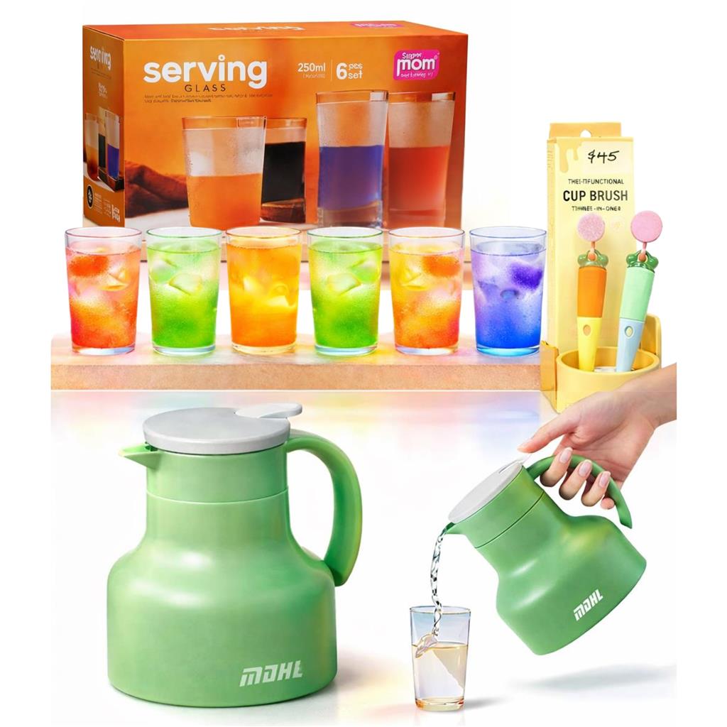 💐 Mother’s Day Kitchen Essentials Set 💐 ✨ Product Highlights All-in-One Kitchen Upgrade A thoughtfully curated set combining style, functionality, and convenience—perfect for everyday use and special moments. Perfect Mother’s Day Gift 🎁 A practical yet elegant gift that shows love and appreciation, making Mom’s daily routine easier and more enjoyable. ☕ MDHL Mountain Spring Insulating Pot (700ml) 700ml Generous Capacity – Ideal for serving multiple cups of tea or coffee Premium Stainless Steel Build – Durable, rust-resistant, and long-lasting Excellent Heat Retention – Keeps beverages hot or cold for extended periods Lightweight & Easy to Handle – Comfortable grip for effortless pouring Modern Elegant Design – Enhances the look of any kitchen or dining setup 🥤 Super Mom Serving Glass Set (6 Pieces) High Clarity Glass Finish – Beautifully displays drinks and beverages 250ml Ideal Capacity – Perfect for juice, water, iced tea, or soft drinks Stylish Gradient Base – Adds a vibrant and elegant touch Durable & Daily-Use Friendly – Strong enough for regular use yet classy for guests Set of 6 – Perfect for family gatherings or entertaining 🧼 3-in-1 Multifunctional Cup Brush Deep Cleaning Design – Reaches corners, edges, and narrow spaces easily 3-in-1 Functionality – Multiple brush heads for versatile cleaning Gentle on Glassware – Cleans effectively without scratches Easy to Use & Store – Compact and convenient kitchen essential 🎁 Ideal For Mother’s Day gifting Housewarming presents Everyday kitchen upgrades Tea & coffee lovers SOLD BY TRINIRETAIL